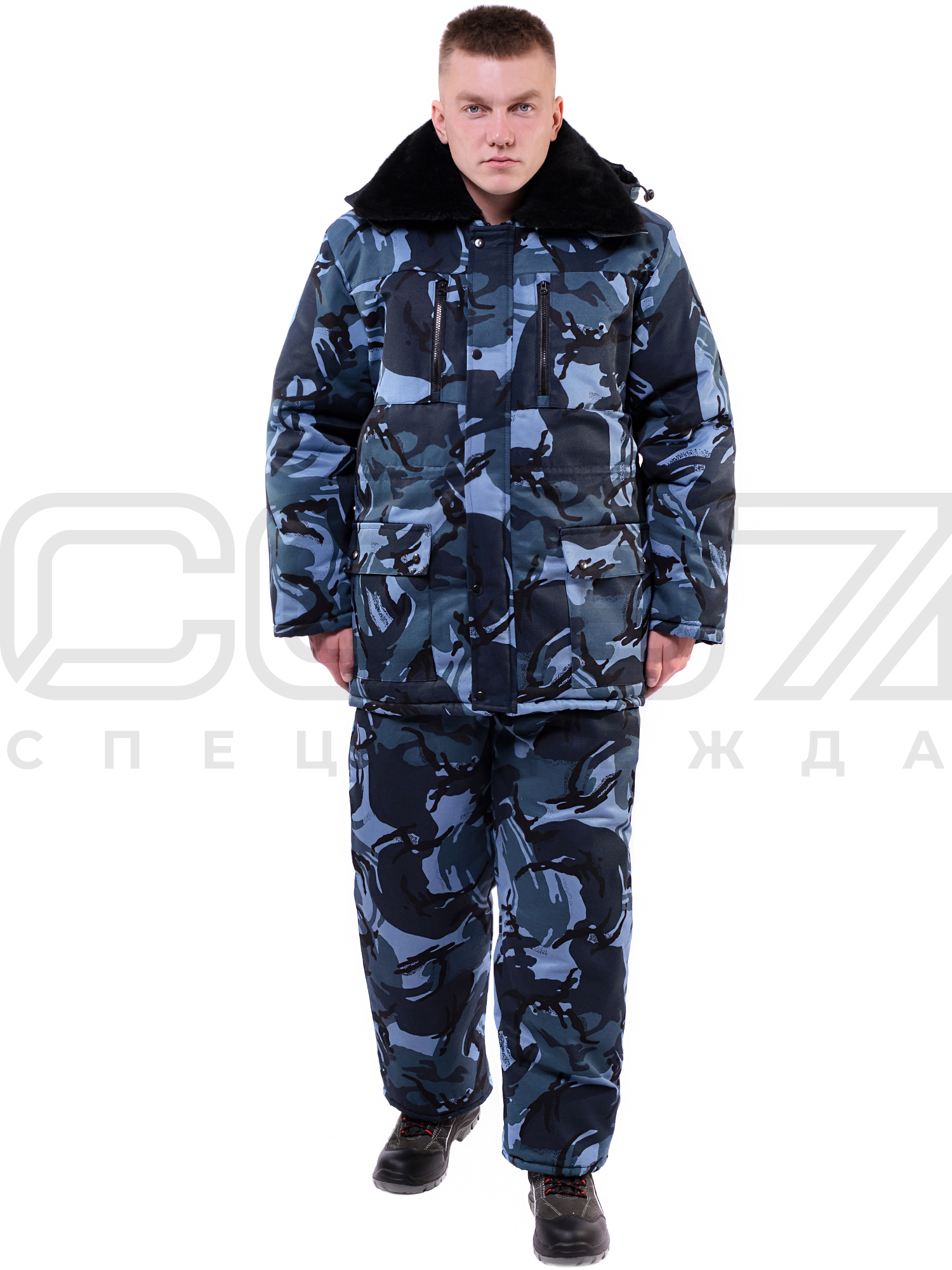 Костюм рабочий зимний охранника "Гарнизон" цв.кмф/синий тк.грета (куртка+пк) в Сахалине
