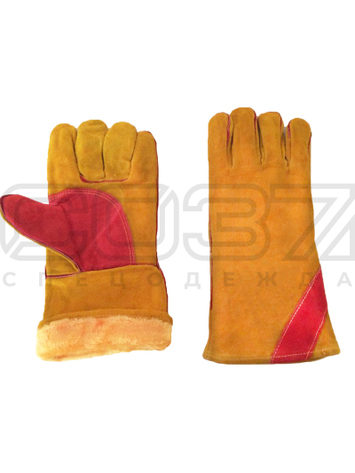 Краги спилковые, утеплённые, жёлтые с красным усилением.